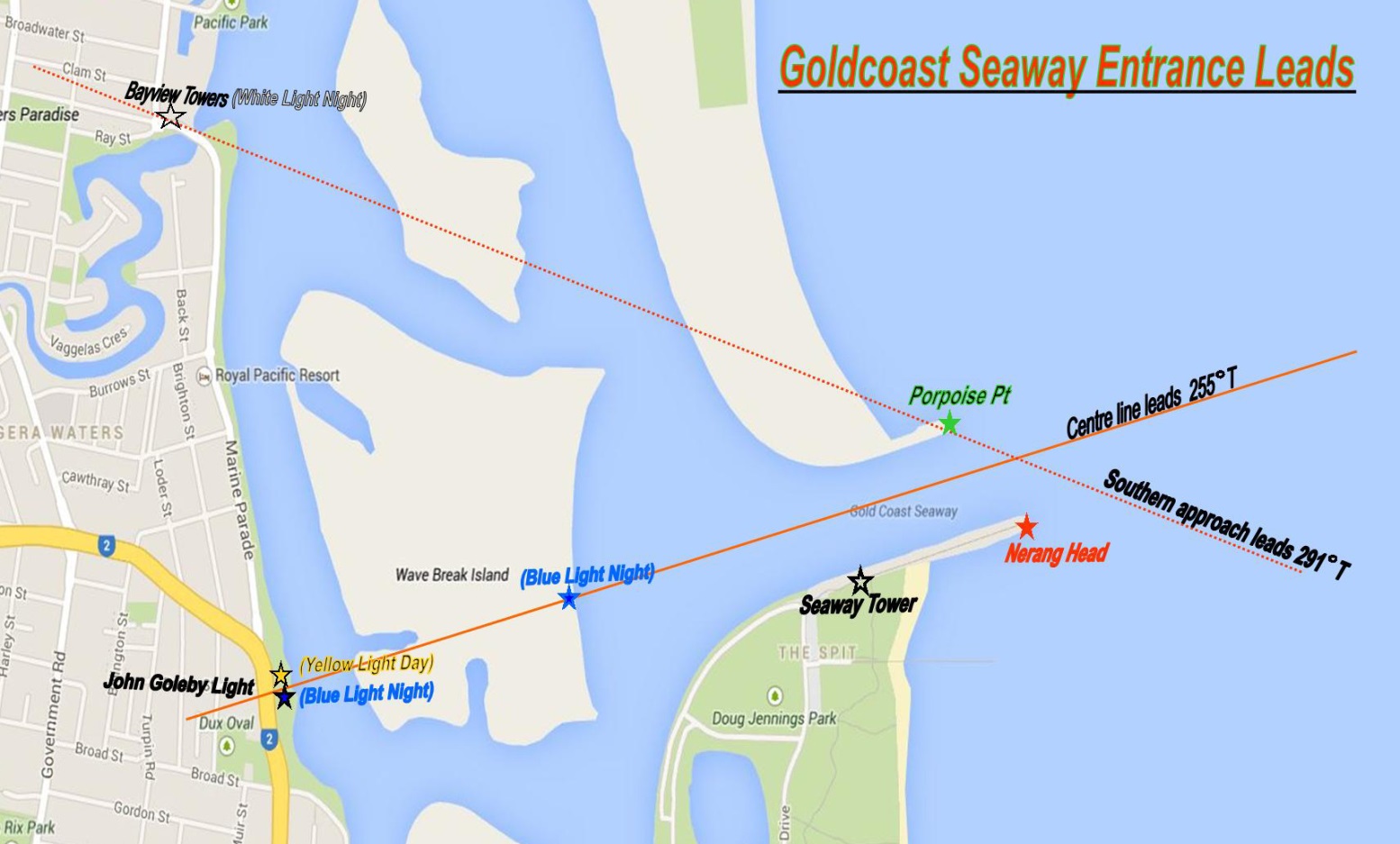 There are no entrance leads for vessels approaching the Gold Coast Seaway from the NORTH. Vessels from the north should sail past the Seaway entrance to a Way Point at 27º56.33 S -153º26.95E and then follow the SE Clearance lead lining up the Green beacon (Porpoise Point) with the tallest tower at Bayview Harbour (White light at night) on a bearing of 291ºTrue. When crossing the seaway look left and line up the Centre Line lead with the concrete structure on Wave Break Island (Blue light night) with the John Goleby Light (Yellow light Day, Blue light night) on a bearing of 255ºT.